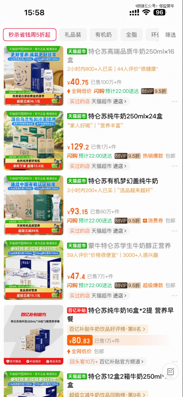 但如果我说,一箱250mlX16盒的特仑苏牛奶,在某猫超市也才40元呢?