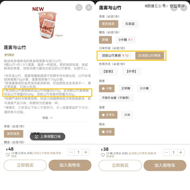 阿嬷手作贴心地为新品设置了两个付费门槛,分别是38元和48元两个价位。其中的10元差价,主要是在48元版本中,除了果茶本身的山竹含量有所增加外,还额外添加了30g顶部山竹果捞。