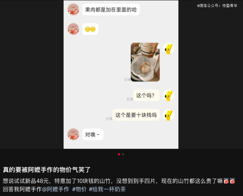 还有人拿到果茶之后,难以置信地拍下照片,在外卖平台问商家:“这个吗?是这个要10块钱吗?”而阿嬷只是淡淡回复,“对噢~”留下内伤的消费者默默消化。
