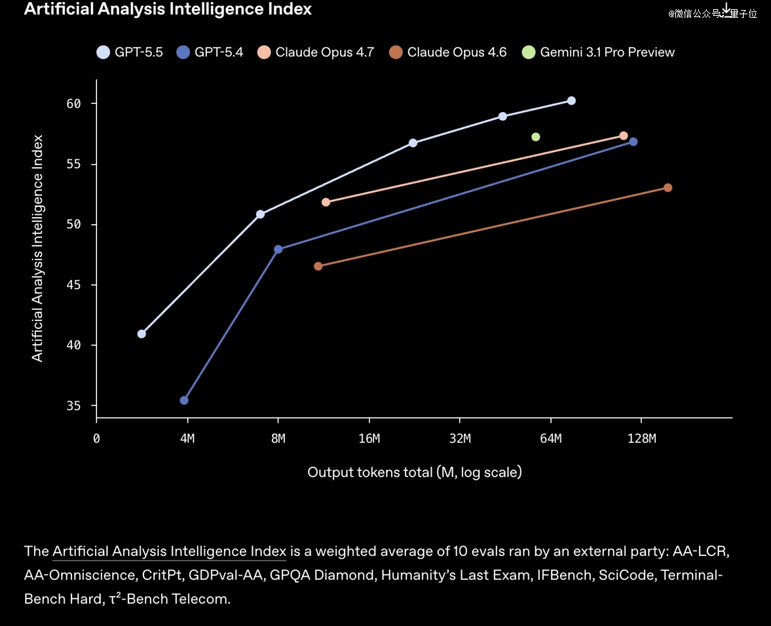 GPT-5.5获得相同的分数比Claude Opus 4.7和其他模型消耗token更少。