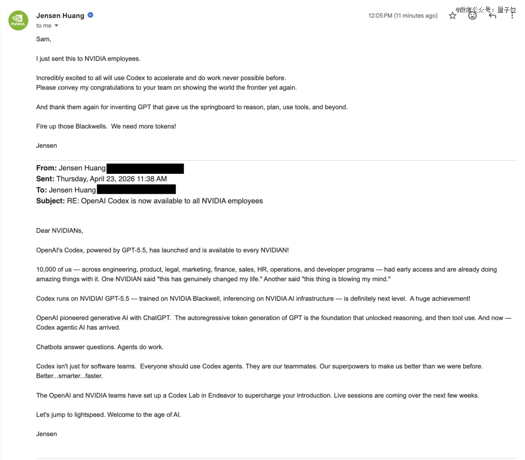 第二,推广Codex到英伟达全公司,奥特曼还晒出了与老黄的邮件。