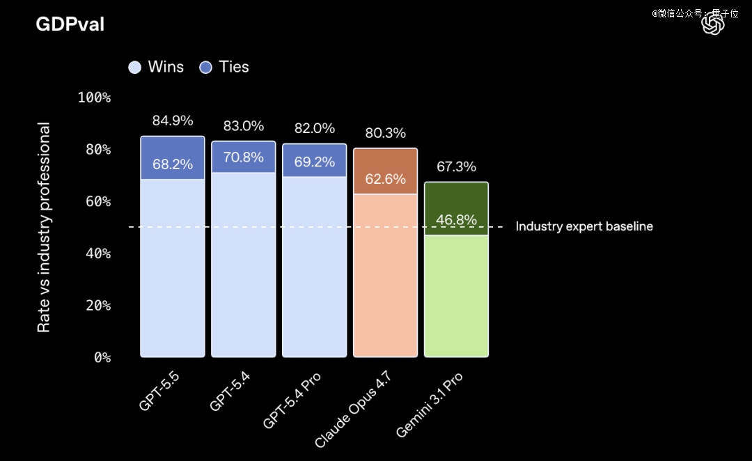 在知识工作基准测试GDPval上,GPT-5.5拿到84.9%,比Claude Opus 4.7高出4.6个百分点。