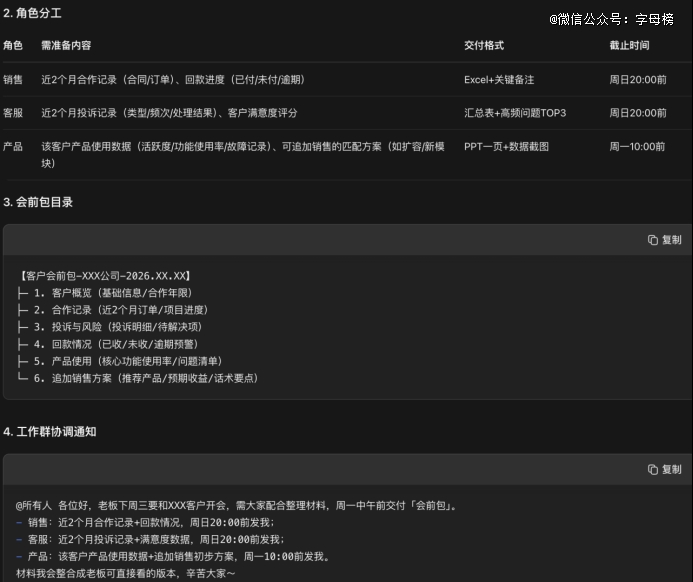会前包目录也被细化成客户概览、合作记录、投诉与风险、回款情况、产品使用、追加销售方案六个模块;最后那条工作群消息,甚至连每个部门的截止时间都补上了。