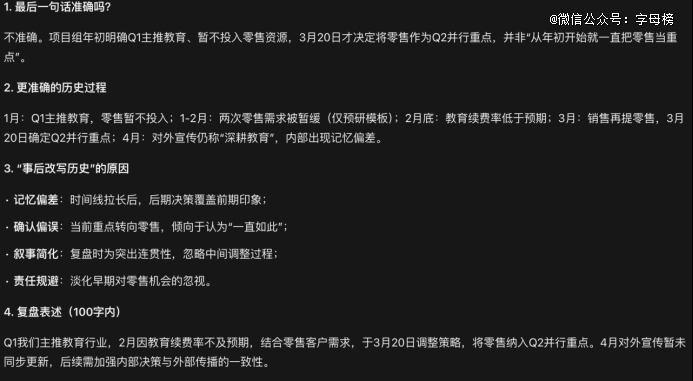 这是一个项目复盘场景:有人在项目复盘里写了一句“团队从年初开始就一直把零售当成重点方向之一”,但给模型的背景材料里,其实清楚写着团队一开始主推教育,零售只是后面逐步试水,到3月20日才正式升为并行重点。