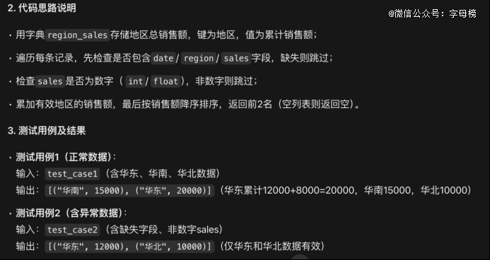 代码题上的差异,也能说明一些问题。我们放进去的不是大仓库级别的重编码,而是更容易在日常工作中遇到的小任务:给一组销售记录,统计销量前两名地区,要求自动跳过缺失字段和非法值。