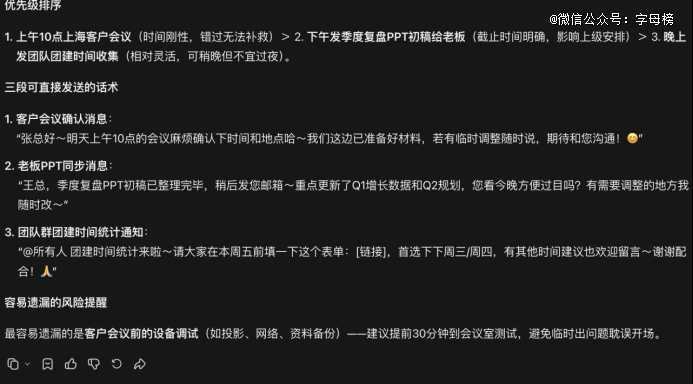 另一类是“任务推进能力”的考量。模型需要在在三件事里排优先级:上午10点上海客户会议、下午交季度复盘PPT初稿、晚上发团建时间收集通知,并要求它顺手把三段消息都写好。