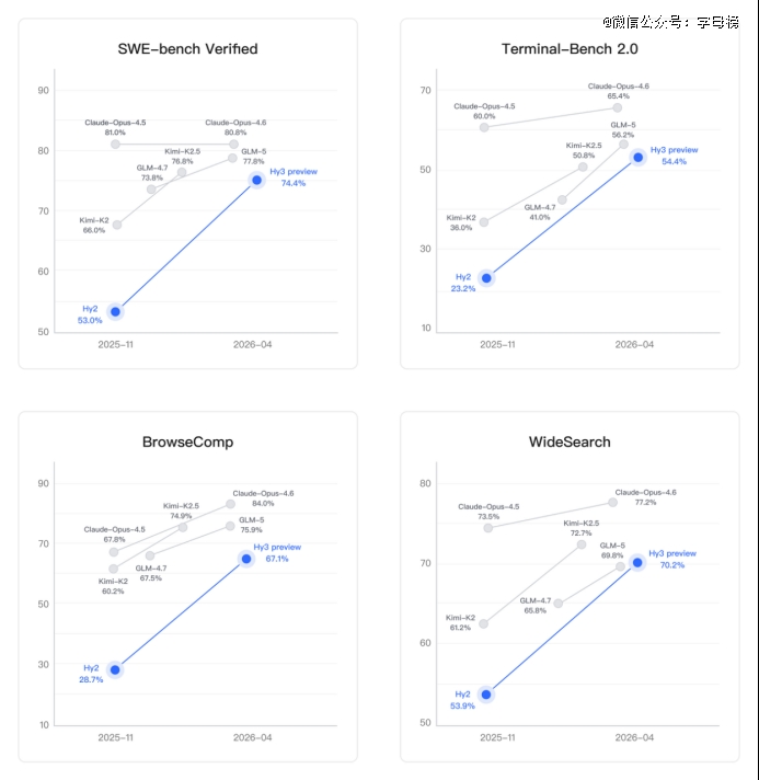 而在混元3.0预览版上,也能看出这种重构后的取向。腾讯方面披露的信息显示,Hy3 Preview以较快的速度在 SWE-Bench Verified、Terminal-Bench 2.0 等主流代码智能体基准,以及 BrowseComp、WideSearch 等主流搜索智能体基准中,都追近了几大主流模型。