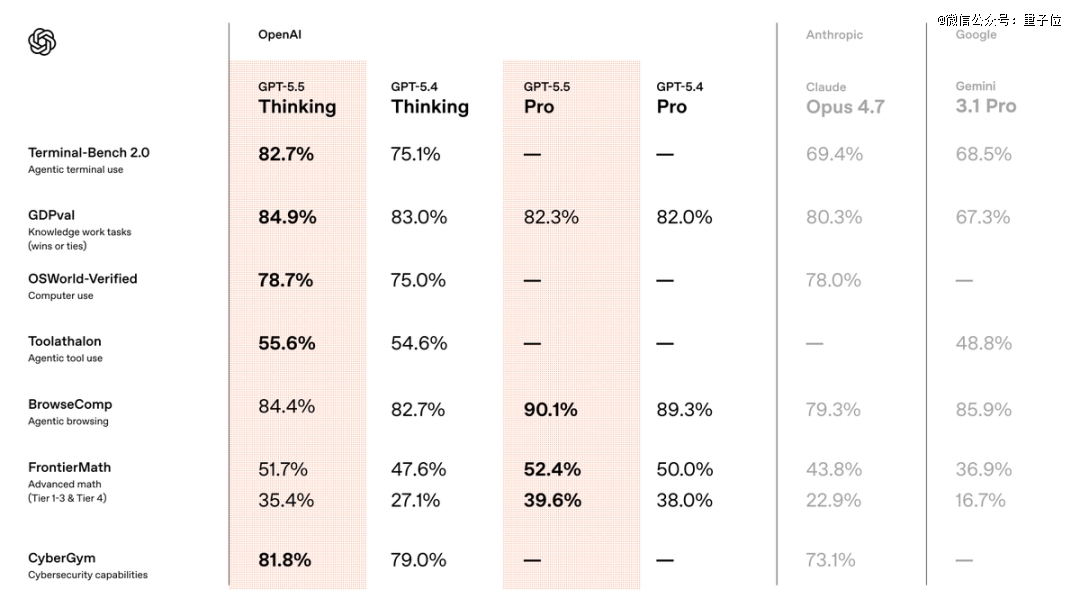 在知识工作基准测试GDPval上,GPT-5.5拿到84.9%,比Claude Opus 4.7高出4.6个百分点。