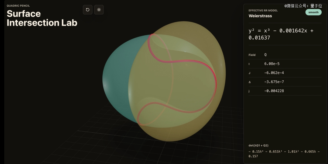 这个应用能画出两个二次曲面的交线,标成红色,还能用Riemann-Roch定理把交线转成Weierstrass曲线的标准形式。后来他又扩展了更稳定的奇点可视化功能。