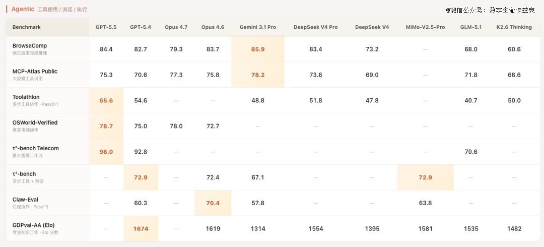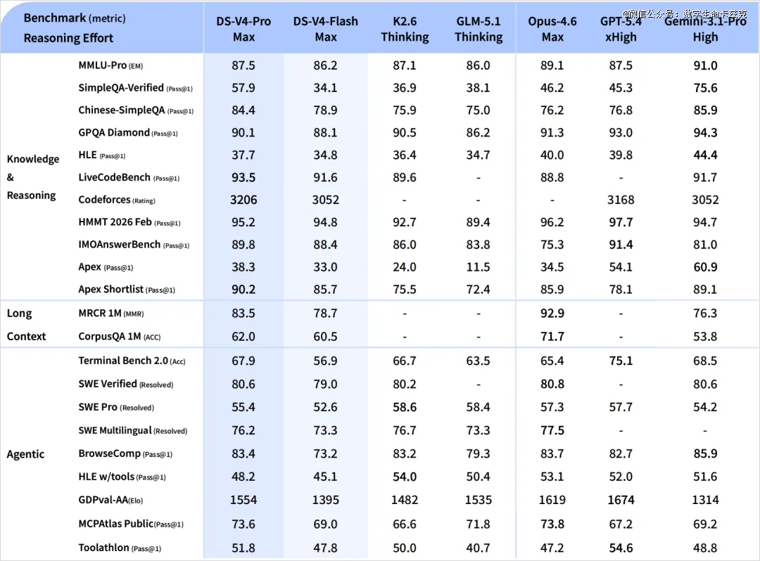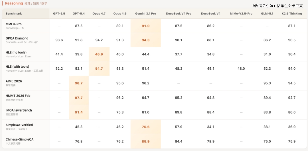可以看到DeepSeek最强的还是SimpleQA这两个知识类的,逼近Gemini 3.1 Pro,在其他的地方只能说中庸。