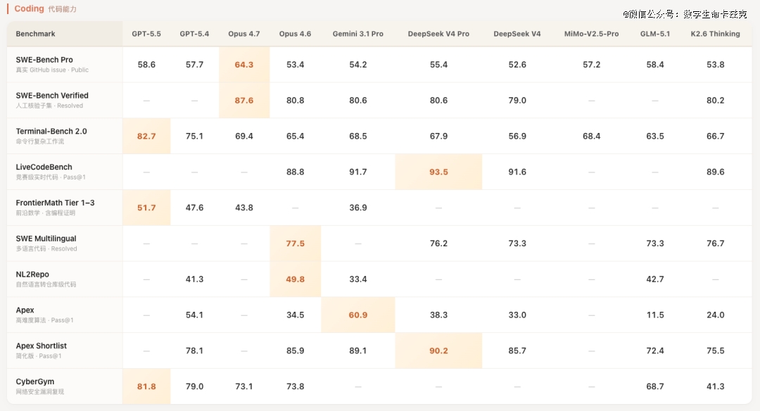 代码这块我觉得也可以把Arena最新的评分放出来,目前DeepSeek V4排第三,*还是GLM-5.1,MiMo没上榜是因为还没开源出来,目前只有API,开源估计下周了。