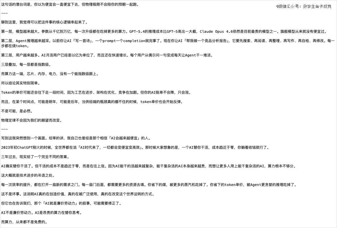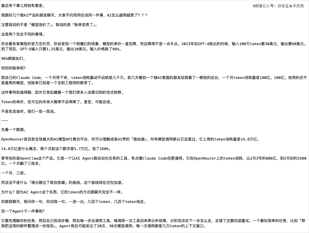 但是因为大带来的提升,也变向带来了Token的涨价,算力就那么多,模型参数越来越大,Agent推理所用的Token又越来越多,不涨价都不可能了。