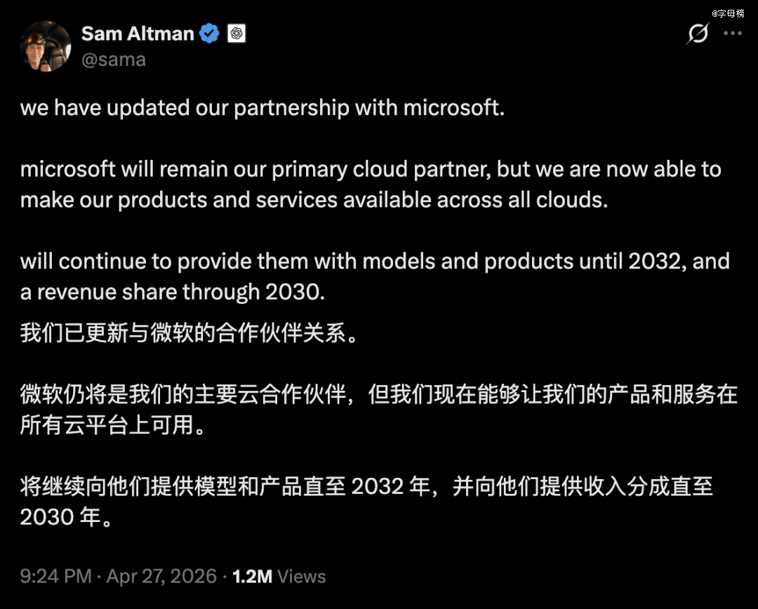 4月27日,奥特曼发文称,OpenAI已经更新了与微软的合作伙伴关系。