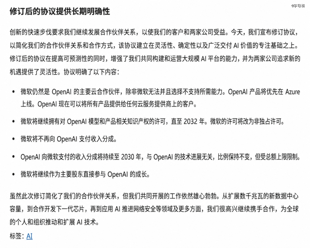 但新协议把这件事说得更清楚了:至少在收入分成这件事上,不管OpenAI的技术进展到哪一步,OpenAI都要继续向微软支付到2030年。