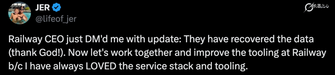 不过,Jer Crane 在给 Railway CEO 发送私信后得到回复,目前已经恢复了数据。