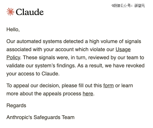 「检测到违反使用政策的活动,您的账号已被暂停。如需申诉,请通过以下链接提交。」