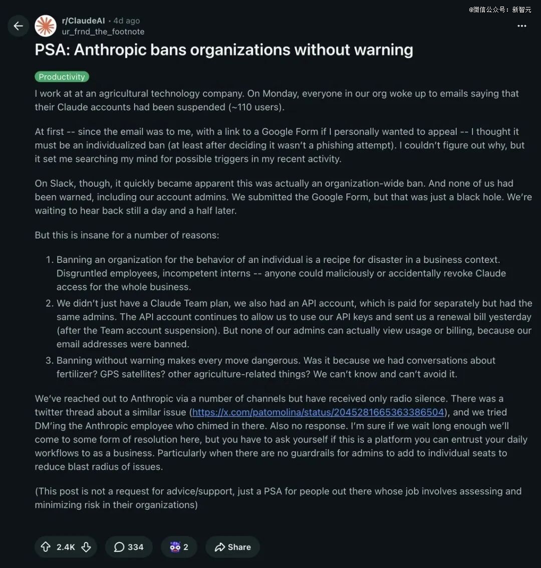 「Anthropic封了我们整个公司的账号,110个人,零预警。」