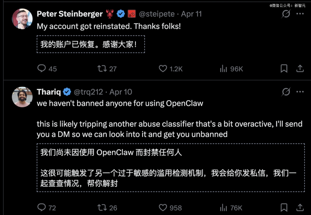 Anthropic工程师Thariq否认与OpenClaw有关,第二天Peter Steinberger账号就恢复了——同样没有任何正式解释。