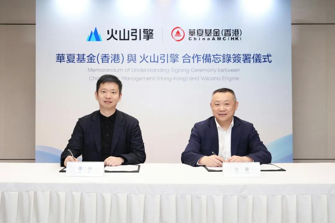 在签约仪式上,华夏基金(香港)行政总裁甘添、火山引擎总裁谭待共同签署了合作备忘录。