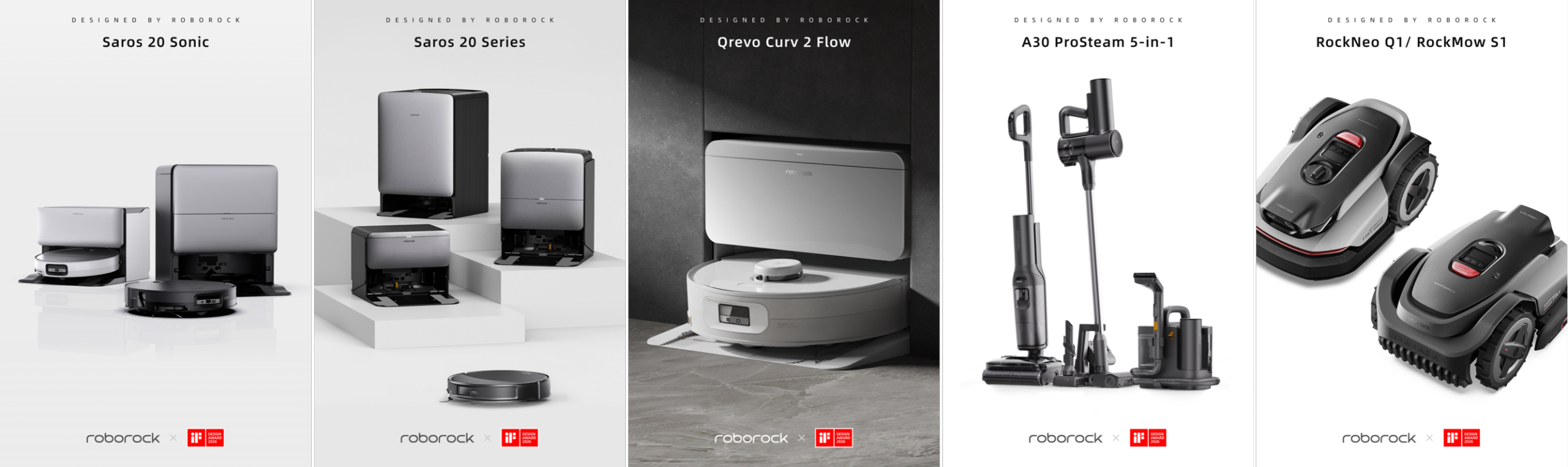 石头科技此次获奖产品覆盖了扫地机器人、洗地机及智能割草机等多个品类,充分体现了其全场景智能清洁生态的布局与深厚的设计功底。获奖产品包括:扫地机器人Saros 20 Sonic(G30S Pro系列)、扫地机器人Saros 20 Series、扫地机器人Qrevo Curv 2 Flow(P20活水版)、洗地机A30 Pro Steam 5-in-1(5合1版),以及割草机RockNeo Q1与RockMow S1。