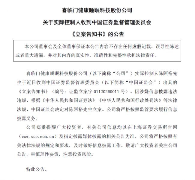 4月1日,中国证监会一纸立案告知书,将喜临门实际控制人推至风口浪尖。公告显示,实控人因涉嫌信息披露违法违规,被证监会立案调查。消息甫出,市场哗然。实控人突遭立案,公司经营是否因此陷入动荡?