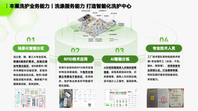 与多数平台采用外包工厂不同,丰巢洗护选择自建后端资产,以实现对履约全流程的掌控。2023年和2024年,其先后在中山、嘉兴建设两座智能洗护中心。两座工厂均引入RFID全流程追踪和AI智能分拣系统,为每件衣物建立电子标识,实现从收衣到出库的可视化管理。