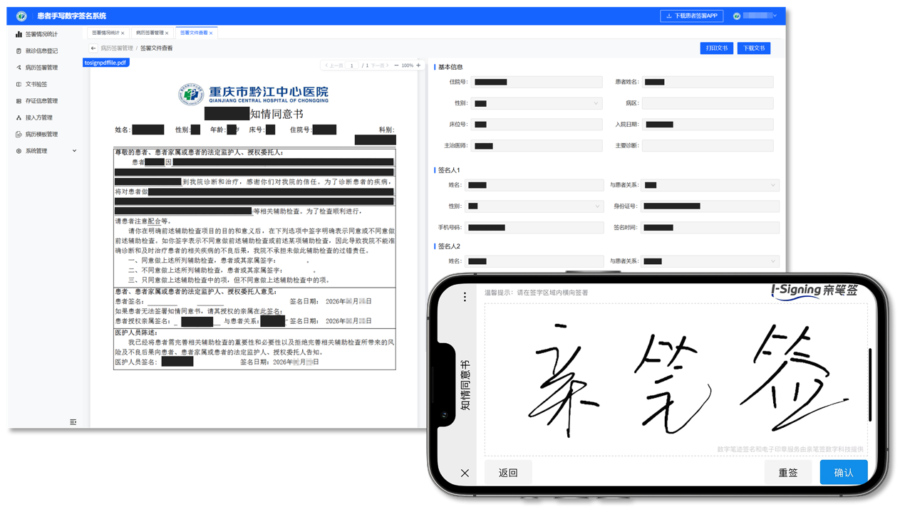在这幅宏伟画卷中,重庆亲笔签数字科技有限公司(以下简称“亲笔签”)依托领 先的数字笔迹AI识别技术,为区域医疗数字化转型构筑覆盖医护技患全角色的可信电子签名签章体系,成为黔江医改智慧医院建设中不可或缺的数字信任基石。