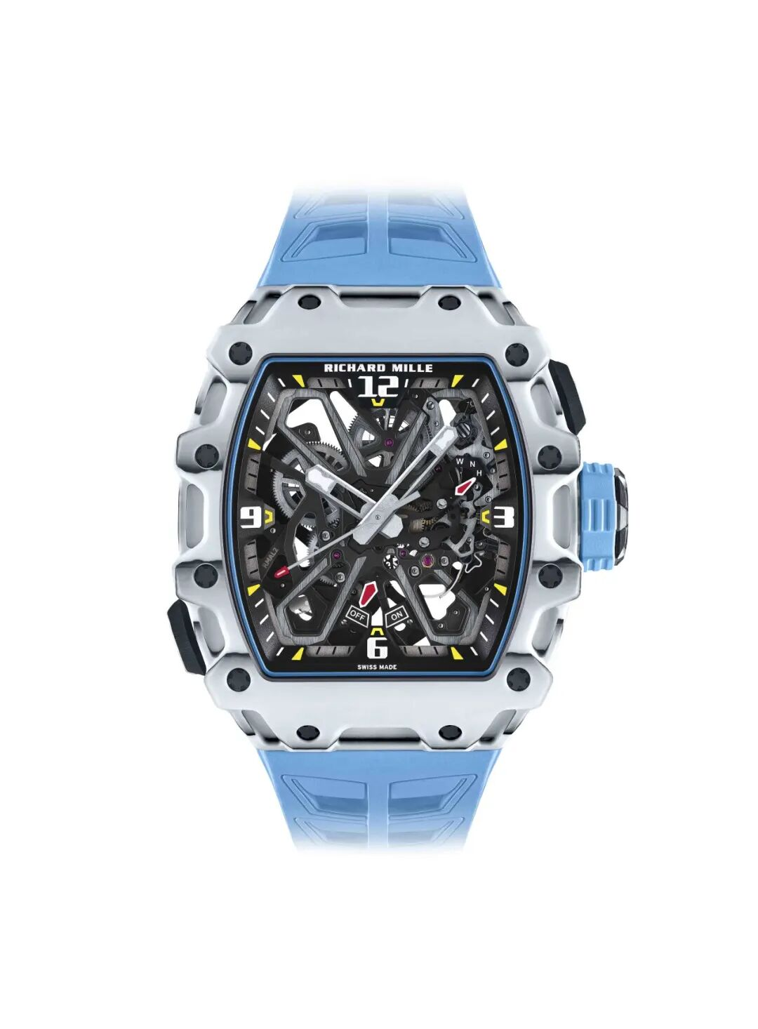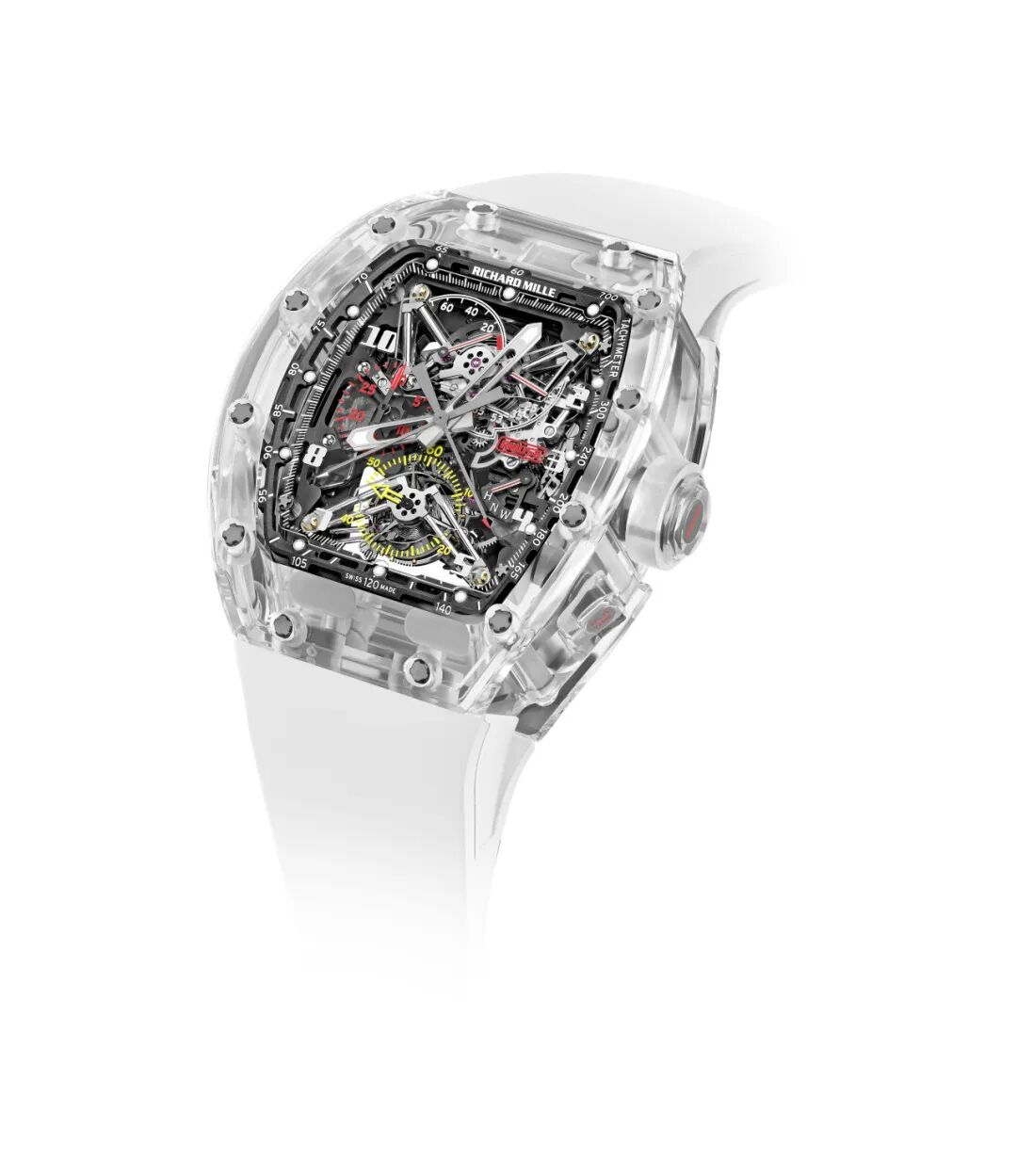 以赛车头盔护目镜为灵感的RM 056 Felipe Massa 采用加工难度极高的蓝宝石水晶表壳,使之兼具高透明度和抗刮擦性能。RM 72-01 Lifestyle 自动上链计时码表则在设计和制造时,对机芯、表壳、表盘进行了整体构思,严格遵循专业要求,移除镶圈,将机芯通过4颗钛制螺丝和弹性金属橡胶(ISO SW)固定在底架上,呈现出和谐统一的视觉效果。