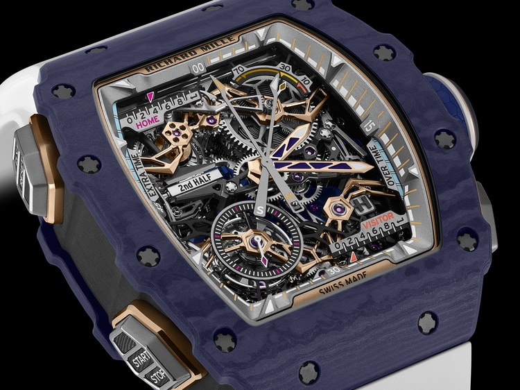 这款机芯集成多项复杂功能,其中两大全新专属功能尤为引人注目。位于9点钟位置的赛事阶段指示器,可实时显示当前赛事所处阶段,每次重置飞返计时功能,显示便会自动从上半场推进至下半场,随后切换至加时赛的上下半场,精准契合足球赛事的时间规则;环绕机芯四周的机械进球计数器,则通过2点钟与4点钟位置的专属按钮,分别记录主队与客队的进球数,每次按压,指针便通过专属齿轮系统沿金属轨道推进,最多可记录9粒进球后自动归零,将绿茵场上的每一次得分瞬间定格为机械记忆。
