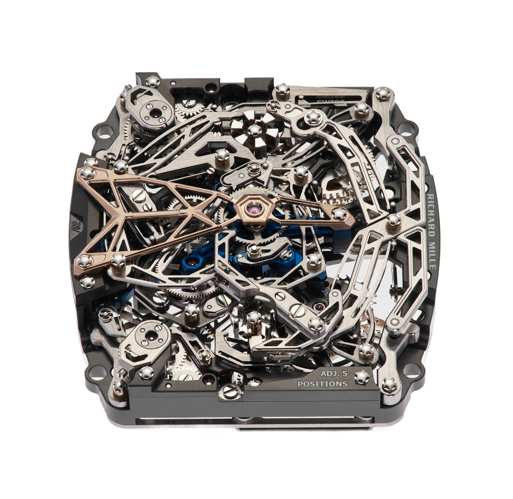 机芯作为腕表的核心,是RM 41-01的最 大亮点之一。该腕表搭载的RM 41-01钛合金机芯,由RICHARD MILLE与Audemars Piguet le Locle联合研发,耗时五年从零打造,是一枚取得专利认证的全新陀飞轮飞返计时机芯,其复杂程度媲美品牌*机芯作品。机芯采用微喷砂五级钛合金打造,底板与桥板经过高度镂空处理,为内部650枚精密零件预留充足空间,既有效减轻腕表重量,又能清晰展现机械运转的精妙韵律。