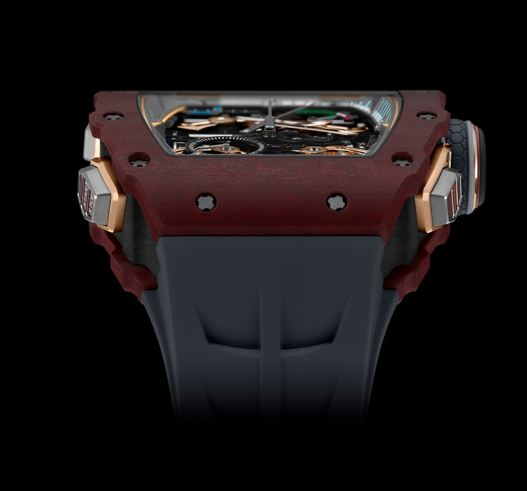 在材质与外观设计上,RM 41-01延续品牌标志性的酒桶形表壳,由105枚零件组成,尺寸为43.23mm×49.65mm,厚度16.08mm,曲面设计贴合手腕,兼顾佩戴舒适度与腕间存在感。腕表推出两款设计版本,均限量30枚,其中一款采用RICHARD MILLE与North ThinPly Technology(NTPT™)联合研发的全新胭脂红Basalt TPT®玄武岩纤维材质,这是该材质首次应用于品牌腕表,40微米厚的玄武岩纤维以45°角交错堆叠,呈现出近似天然木纹的独特纹理,兼具卓 越机械性能、耐化学腐蚀性、热稳定性及抗紫外线特性;另一款则采用深蓝色Quartz TPT®石英纤维材质,两款版本的中层表壳均使用Carbon TPT®碳纤维材质,进一步提升腕表的耐用性。