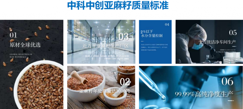 在生产和品控环节,中科中创的投入同样用心。中科中创新增近2000平米十万级洁净无菌车间,年处理亚麻籽能力提升至5000吨以上,成品水分控制在2%以下,洁净度达99.99%。从原料的全球采购——锁定加拿大进口金色亚麻籽,并建立覆盖全球的原料数据库,到生产过程中的多重筛选、去石、磁选,再到成品出厂前的第三方检测,中科中创整个服务链条实现了全程可追溯。