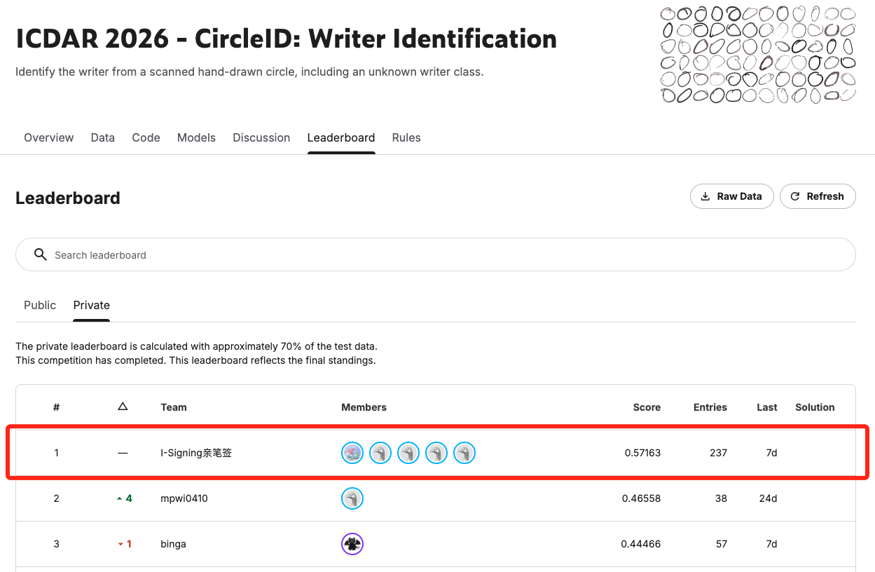 在日前落幕的ICDAR 2026 - CircleID: Writer Identification(圆圈书写者身份识别)全球挑战赛中,重庆亲笔签数字科技有限公司(以下简称“亲笔签”)算法专家覃勋辉率领团队,力压全球113支参赛队伍,以超第二名10.6个百分点的*优势斩获世界*,中国技术再次征服全球!