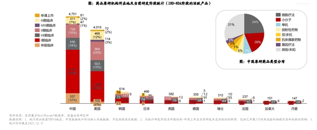 截至2025年12月31日,全球在研(研发阶段处于申报临床-申请上市)且研发状态活跃的创新药共14088个,中国企业原研药品数量4751个(占比33.7%),超过美国(4019个,28.5%),排名第 一, 中国原研产品76%处于早期研发阶段,以细胞疗法和小分子为主,占比分别为24%和20%,放射性药物、双/多抗、抗体偶联药物等产品占比约为5%