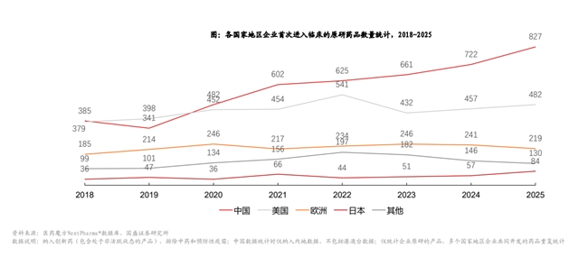 2018-2025年,全球新进临床创新药数量稳步增长,共有11698个(包含处于非活跃状态的产品),中国4639个,占比40%;美国3601个,占比31%; 自2020年后,中国新进临床的创新药数量快速增长,2025年827款原研创新药首次进入临床,数量位居全球第 一,全球占比47.4%。