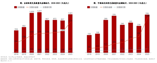 2025年,全球范围内医药交易数量和交易金额大幅增加,交易数量达1021笔(+19%),接近2020-2021年水平;总交易金额增至2751亿美元(+31%),首付款为188亿美元(+45%),均打破历史纪录