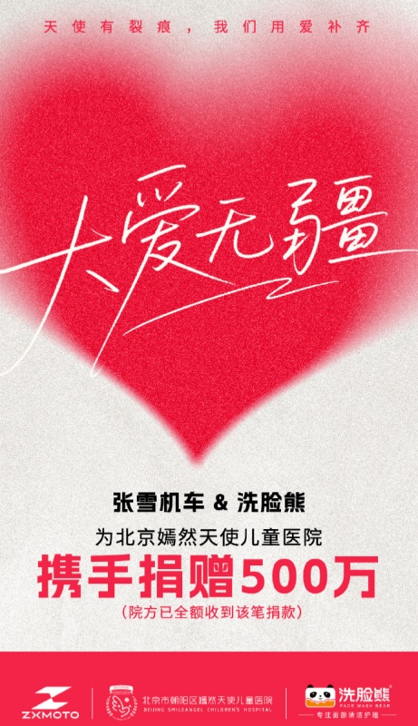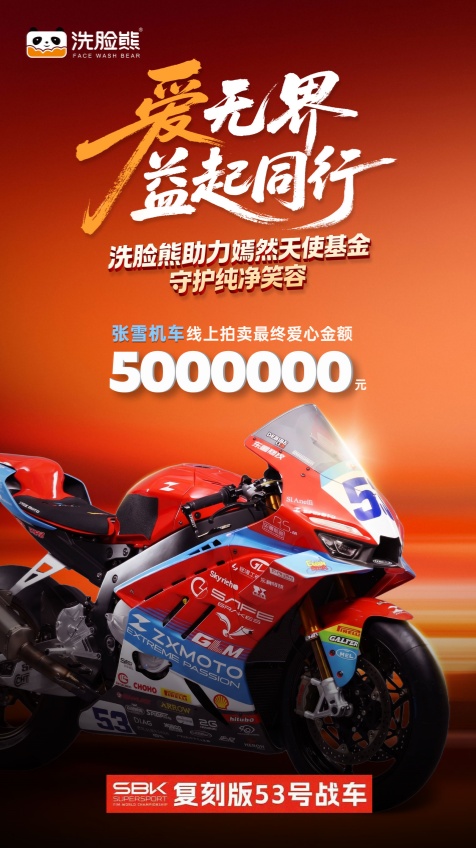 2026年4月10日,张雪机车直播拍卖WSBK夺冠赛车53号复刻版,洗脸熊品牌以45秒速度500万的成功拍下,张雪宣布将全部拍卖所得500万元定向捐赠给嫣然天使基金,洗脸熊此次用实际行动践行品牌社会责任,实现商业影响力与公益价值的双向赋能。