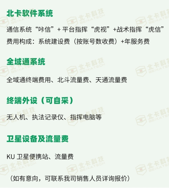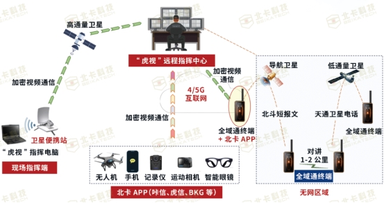 基于北卡双虎系统,全域通终端等各外设+北卡APP(咔信、虎信、BKG等)通过移动网络,实现高清视频指挥、加密即时通信。