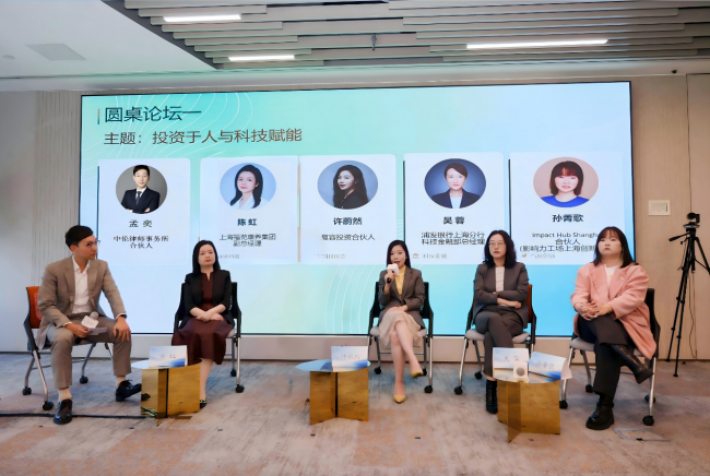 *场圆桌论坛以“投资于人与科技赋能”为主题,由中伦律师事务所合伙人孟奕主持,上海福苑康养集团副总经理陈虹、复容投资合伙人许蔚然、浦发银行上海分行科技金融部见习总经理吴蓉、影响力工场上海创新中心(Impact Hub Shanghai)合伙人孙菁歌等嘉宾围绕康养服务、硬科技投资、科技金融、社会创新等议题深入探讨,分享如何以科技与资本打破性别刻板印象,提升女性在科创与绿色领域的参与度与领导力。