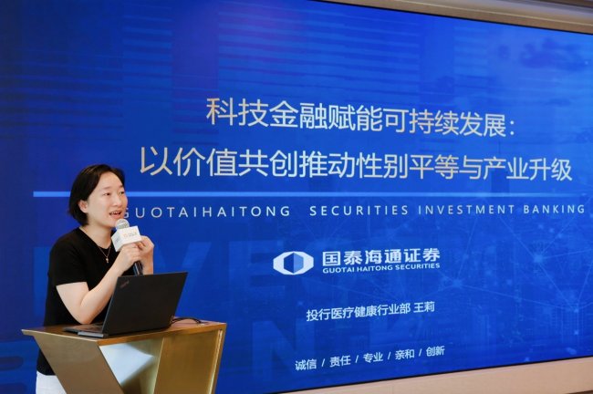 国泰海通证券投资银行业务委员会委员、医疗健康部负责人王莉带来《科技金融赋能可持续发展:以价值共创推动性别平等与产业升级》主题分享。她结合近20年投行从业经验指出,医疗健康行业从来不是只看“硬技术”的战场,更是需要温度、耐心和同理心的事业,这些特质恰恰是女性力量最耀眼的底色。从女性企业家、科研工作者,到女性分析师、投资人、投行伙伴,“她力量”贯穿医疗健康产业全链条。她详细介绍了国泰海通在医疗健康领域的核心优势,凭借连续16年上榜新财富的医药研究团队形成前瞻协同的专业洞察,以贯穿企业早期孵化、私募融资、上市融资、并购重组的全生命周期投行服务,成为医疗健康企业成长的核心伙伴,同时通过投资生态联动、资源导入等方式构建立体产业协同体系,全方位赋能医疗健康领域女性创业者与科研工作者。她以康方生物夏瑜博士、天泽云泰赵小平博士等女性企业家为例,展现女性在创新药、基因治疗等高精尖赛道的突破力与领导力,印证科技金融的核心价值在于以长期资本、专业服务打破性别壁垒,实现性别平等与医疗健康产业升级的双向奔赴。
