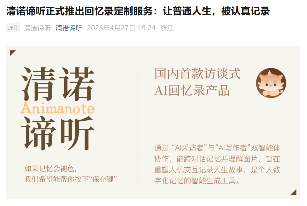 近日,国内*访谈式AI回忆录产品“清诺谛听”(Animanote)正式推出回忆录定制服务。这款运行于微信小程序的产品,通过“双智能体(Agent)”系统,将原本动辄数万元、耗时数月的个人回忆录定制服务,降维成普通人触手可及的普惠服务。