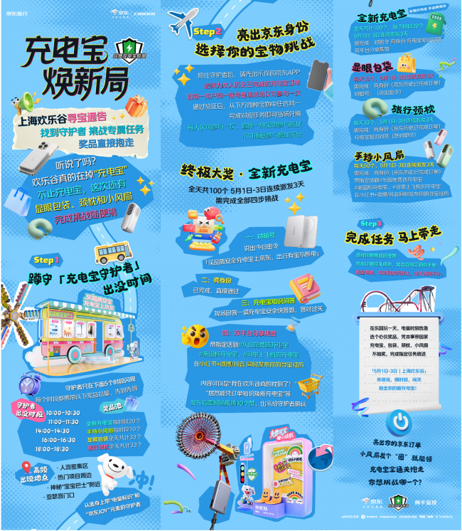 此次京东“2026充电宝焕新局”首站活动巧妙地将线下活动与五一假期出行场景深度融合。活动期间,游客只需在每天10:00-10:30、11:00-11:30、14:00-14:30、16:00-16:30、18:00-18:30五个固定时段,蹲守出没在上海欢乐谷的高架人潮聚集区、热门项目附近、海盗船宝宝乐园附近以及亚瑟宫门口等景区核心位置的充电宝守护者,亮出京东身份按照指引完成“对暗号、亮身份、穿越欢乐谷、对号分享传播”四项专属挑战,即可解锁丰富的活动奖品。